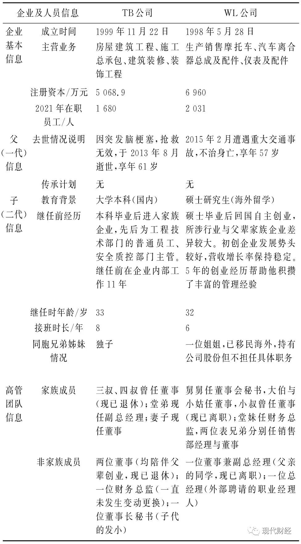 如上所述,本研究将TB公司与WL公司作为案例研究样本。本案例探索与呈现过程中牵涉到公司高管团队及人员之间的冲突与矛盾,出于对家族企业隐私保护的现实考虑,研究对象不愿公开公司具体名称及受访者的身份信息,并要求本团队在学术研究中对相关信息予以匿名化处理。基本信息见表1。