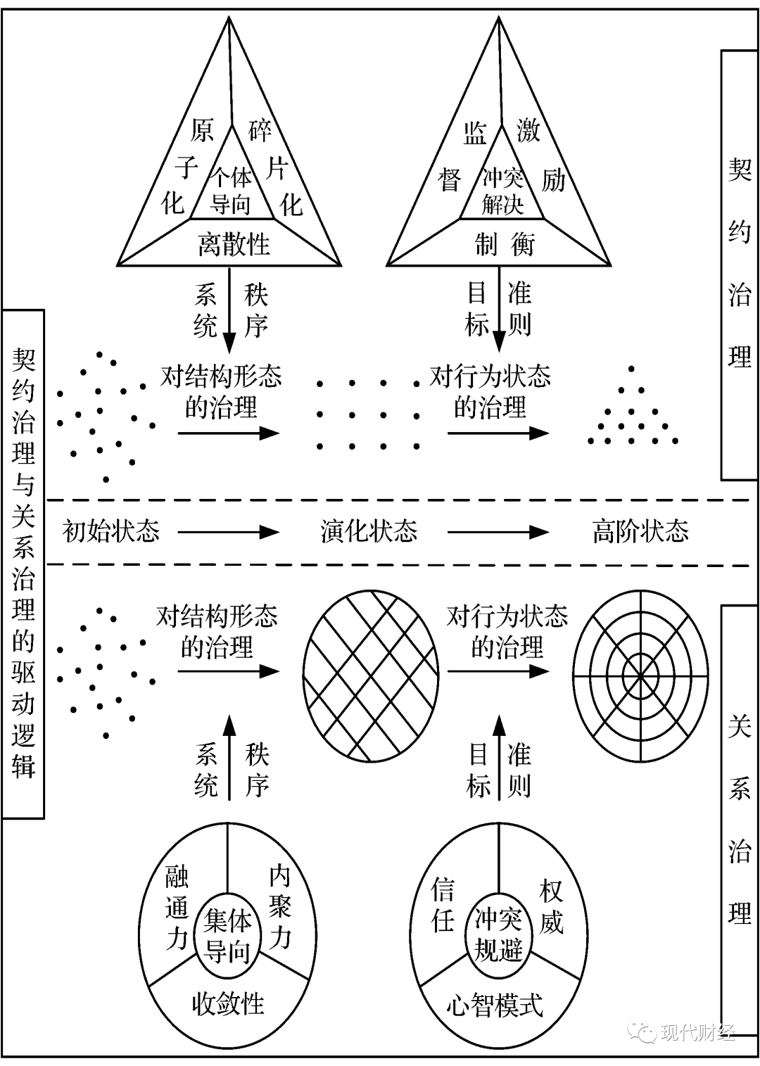 其次,两种治理模式的驱动逻辑存在“怎么样”的差异?《新帕尔格雷夫经济与法大词典》诠释了公司治理的核心内涵,即利益相关者就事后无法预估项而在事前建立起的一系列约束安排[8]。诸多研究把握住企业契约理论精髓,将组织化约为独立个体,认为契约是解决个体间冲突的最优选择[6]。然而,部分学者秉持着行动者共同塑造关系网络的观点,批判上述主张[9]。综上可知,契约治理与关系治理由两种不同的逻辑驱动运作,但关于两大治理体系目标准则与系统秩序的解释仍存在些许空白。