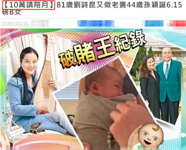 刘诗昆老来得子,对小女儿爱护有加,此前有港媒报道称,刘诗昆花10万请月嫂帮忙看护,相当大手笔。