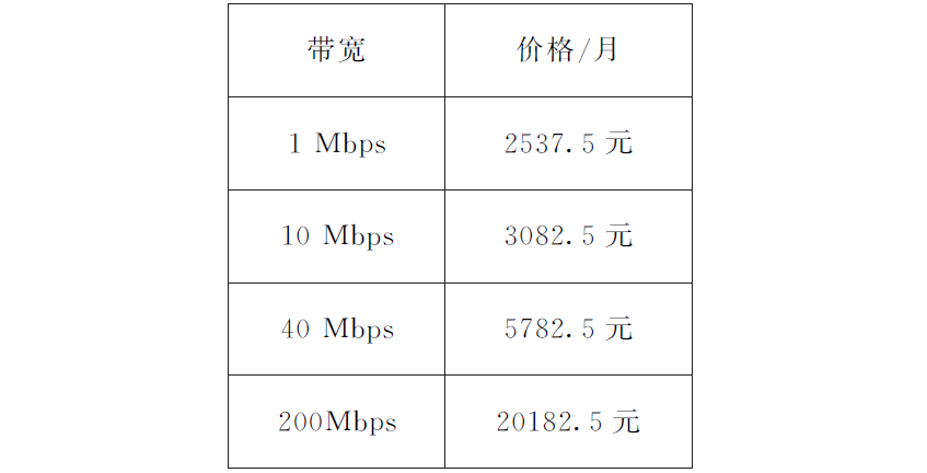 本文对腾讯云服务的付费情况进行了调研。在腾讯云租用一台图形工作站(GPU渲染型GN7vw:8核CPU、32G内存),月租费根据GPU颗数(0.25到1颗)和内网带宽不同,价格在1800到2500元不等。设置公网IP免费,但租用公网带宽需另外收费,分带宽计费和流量计费两种租赁方式。按带宽租赁价格如表2所示。按照使用流量计费,具体又分成按小时(576元/GB/小时)计算和按天(24元/GB/天)计算。从这一实例可看到,与服务器本身租费相比公网使用费要高得多。因此若租用公有云服务,使用成本中大部分将会花费在网络服务上。
