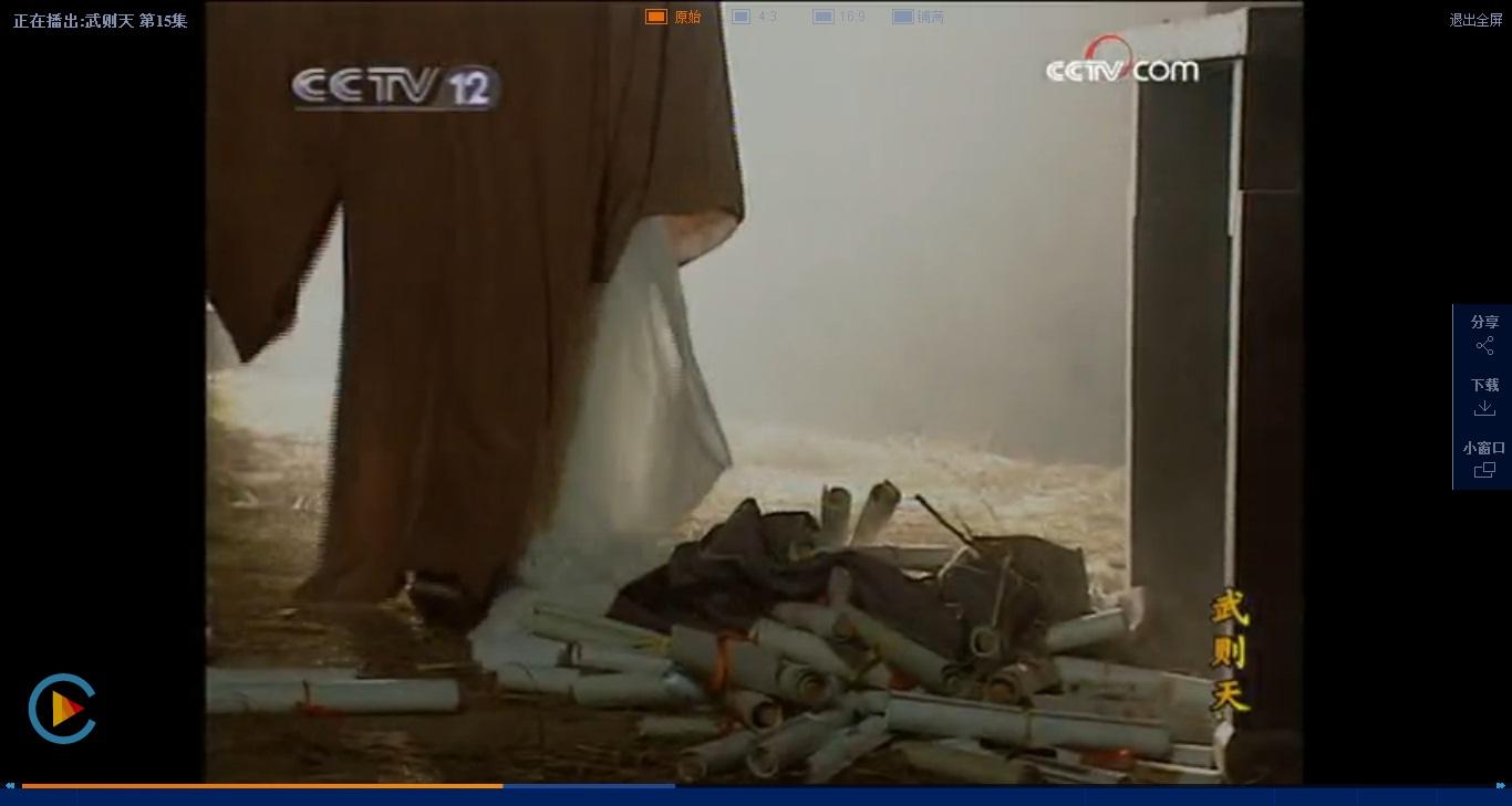 这是第十五集长孙无忌自尽前的镜头,请大家注意画面下方一地的书卷。这不是字画,这是卷轴装的书本。百度百科上说,卷轴装是指将印页按规格裱接后,使两端粘接于圆木或其他棒材轴上,卷成束的装帧方式。卷轴装始于帛书,隋唐纸书盛行时应用于纸书,以后历代均沿用,现代装裱字画仍沿用卷轴装。这让我觉得当时拍这部电视剧的时候道具师傅是用心了的!