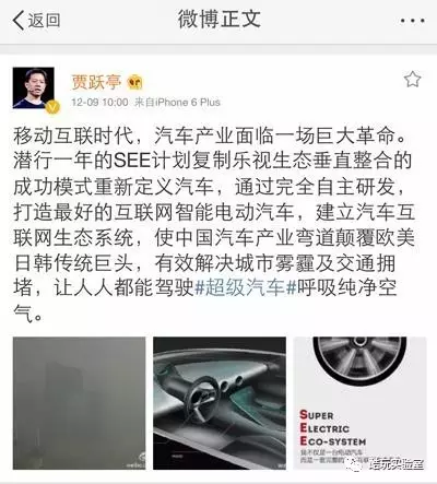 而一番招兵买马过后,贾跃亭终于露出了他的目的,继续吹“乐视生态”的牛逼。他先是在14年12月突然宣布,我要造互联网汽车!彻底“颠覆”汽车行业!!