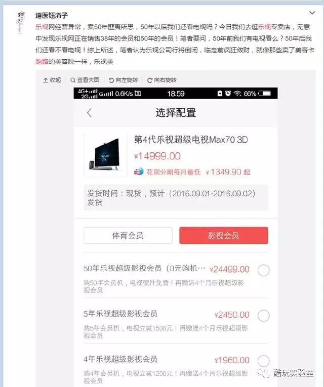 微博网友:浸提我们去逛乐视专卖店,无意中发现乐视网正在销售38年的会员和50年的会员!50年以后我们还看电视吗?……笔者认为乐视公司行将倒闭,临走前疯狂敛财,就像那些卖了美容卡跑路的美容院一样