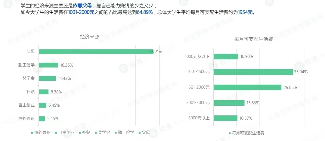 大学费用支出方面,以2020年数据进行分析,据《2020中国大学生消费行为调查研究报告》显示,被调查的来自全国100多所院校的15860名大学生,65%左右人群每月可支配生活费集中在1001-2000元区间,月平均可支配生活费约1954元,其中饮食、学习、生活用品等生活必须约占50%,即大致1000元。大学期间另一项重要支出是学费和住宿费。2021年,大部分普通类专业学费基本为5000~6000元/年,大部分公办院校住宿费多为1000~2000元/年。
