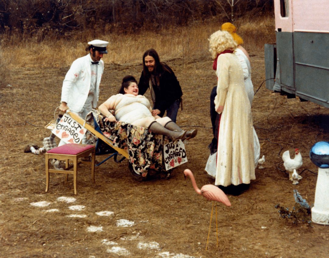 美国演员保罗·斯威夫特(Paul Swift)抱着美国演员兼歌手伊迪丝·梅西(Edith Massey)坐在手推车上,美国演员丹尼·米尔斯(Danny Mills)和玛丽·薇薇安·皮尔斯(Mary Vivian Pearce)出席现场,于《粉红色火烈鸟》拍摄之中,1972年
