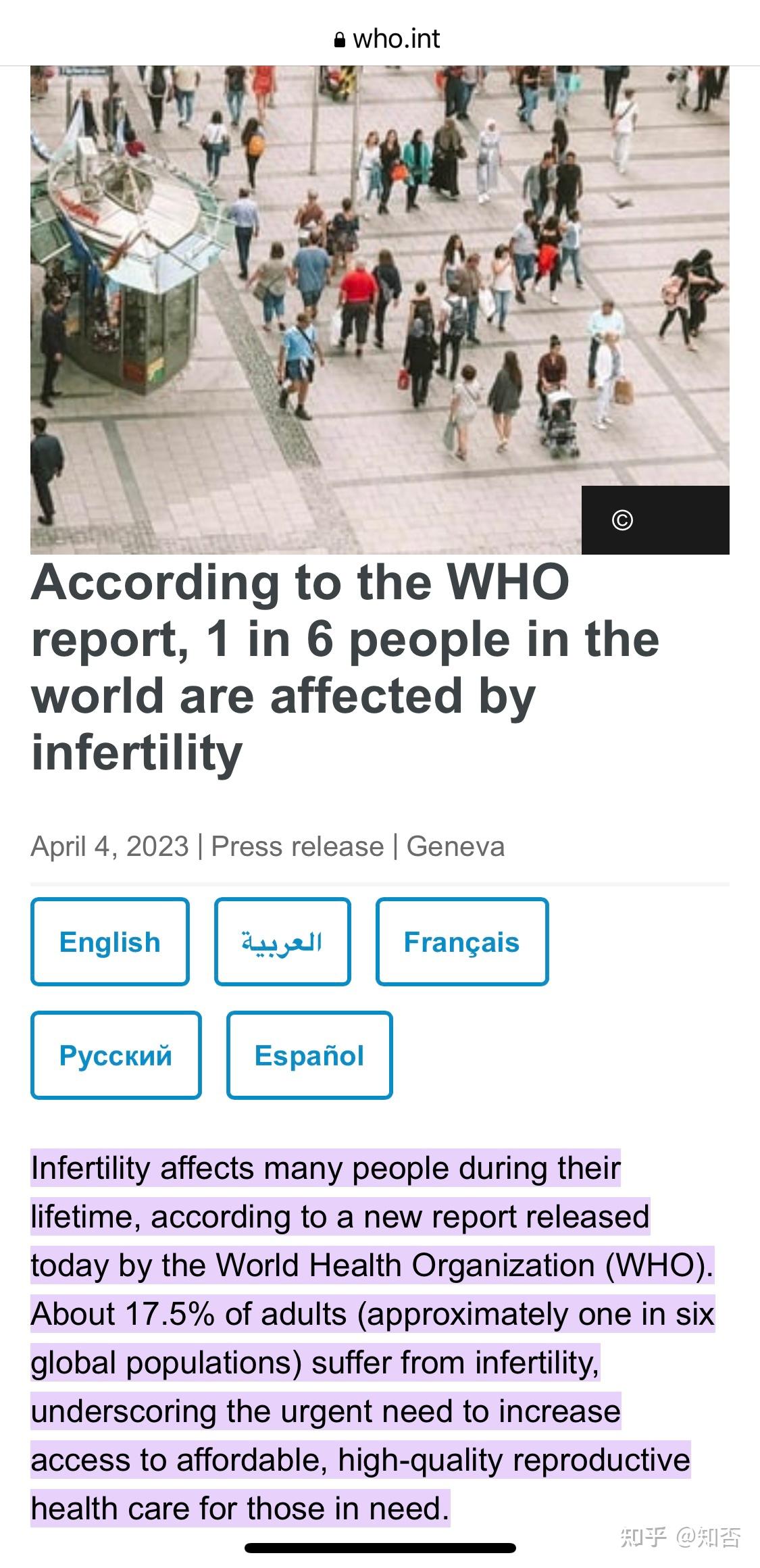刚刚去世界卫生组织的网站上查了一下,这个数据是WHO昨天刚公布的,全球人口接近六分之一不孕症是官方公布的数据。