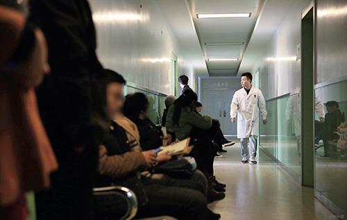 门诊楼走廊内不孕不育夫妇在等待就诊