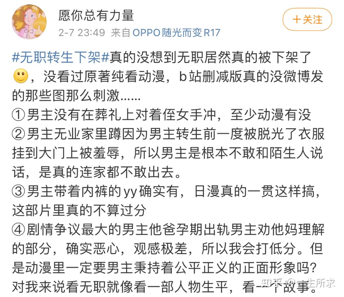 在文娱作品里谈三观本身就是一个非常没有意义的事情,真有意义的话谈的应该是尺度,然而我个人认为无职转生的尺度也没有任何问题,bilibili的审核力度可是比wb大多了,wb那么多女菩萨的尺度没有问题各种妖魔鬼怪满嘴喷粪没有问题,无职转生的尺度也没有问题。