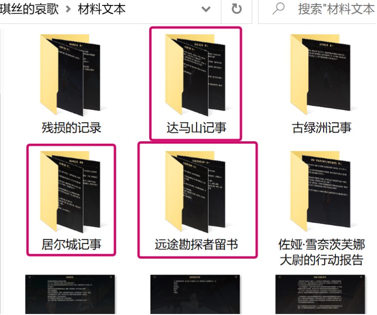 本文上一章材料文本部分中,只框选并讲述了三个找的差不多了的系列文本,也就是上面讲解的达马山记事、居尔城记事、还有远途勘探者留书。不过从笔者的文件夹图里也能看见,其实还有好几个笔者尚没搜集全的系列文本。