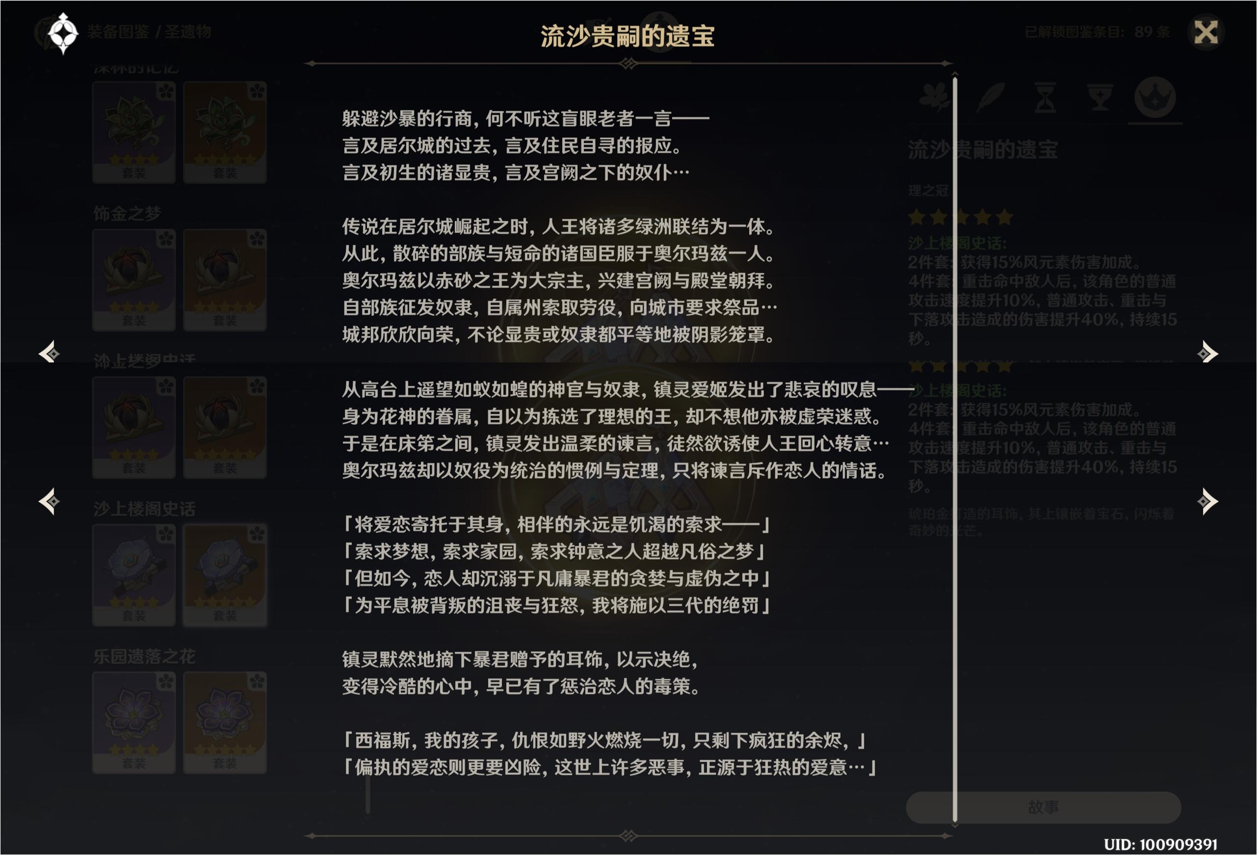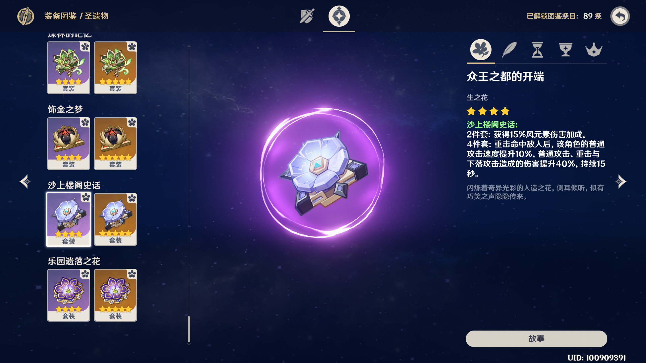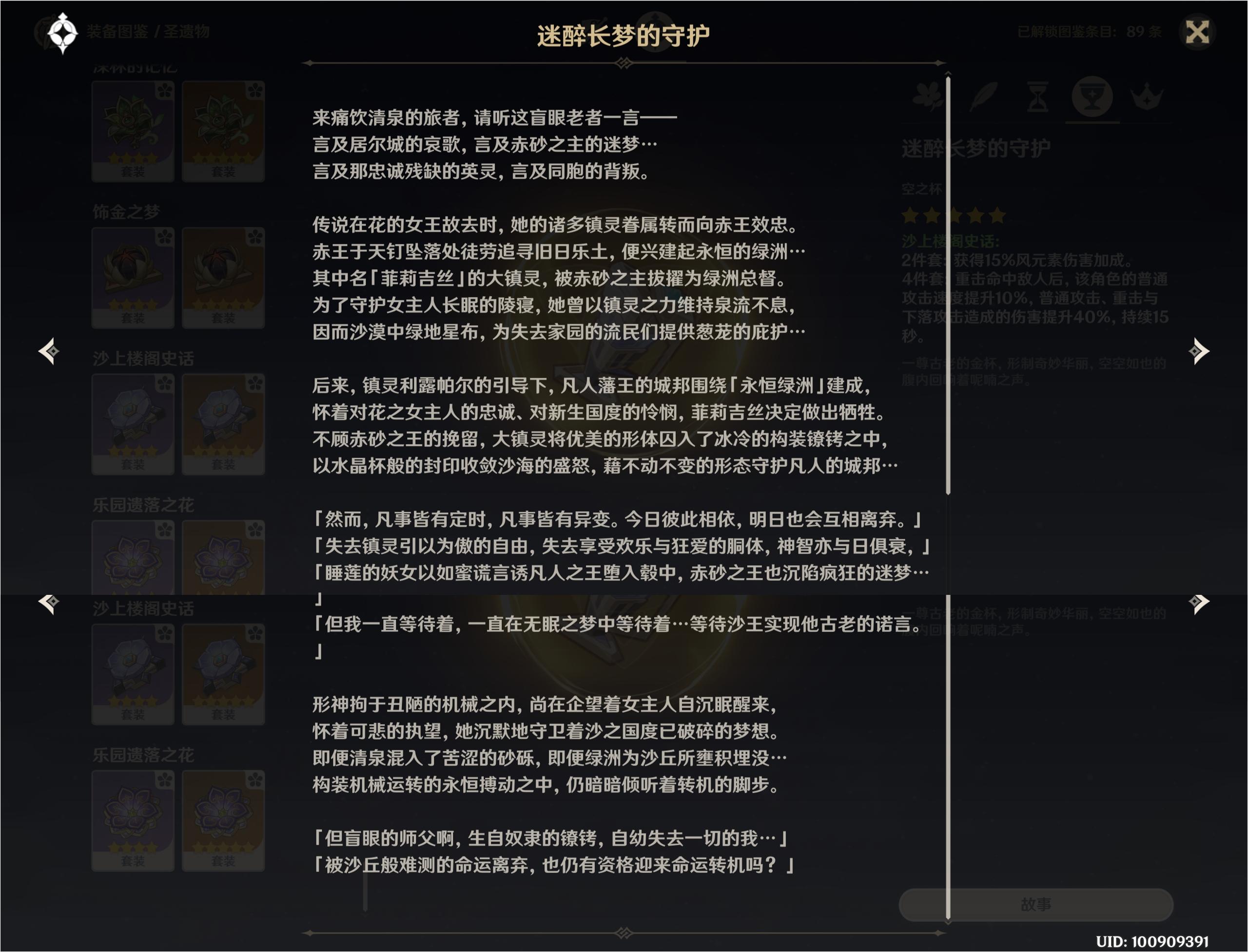 而关于最后遇见的另一位镇灵,菲莉吉丝——说是最精诚守义于花神的一位镇灵也不为过——我们也在刚过去的上个版本(3.3版本)才新出的圣遗物“沙上阁楼史话”(下文暂称“风速套”)的悲哀故事中有所得见。