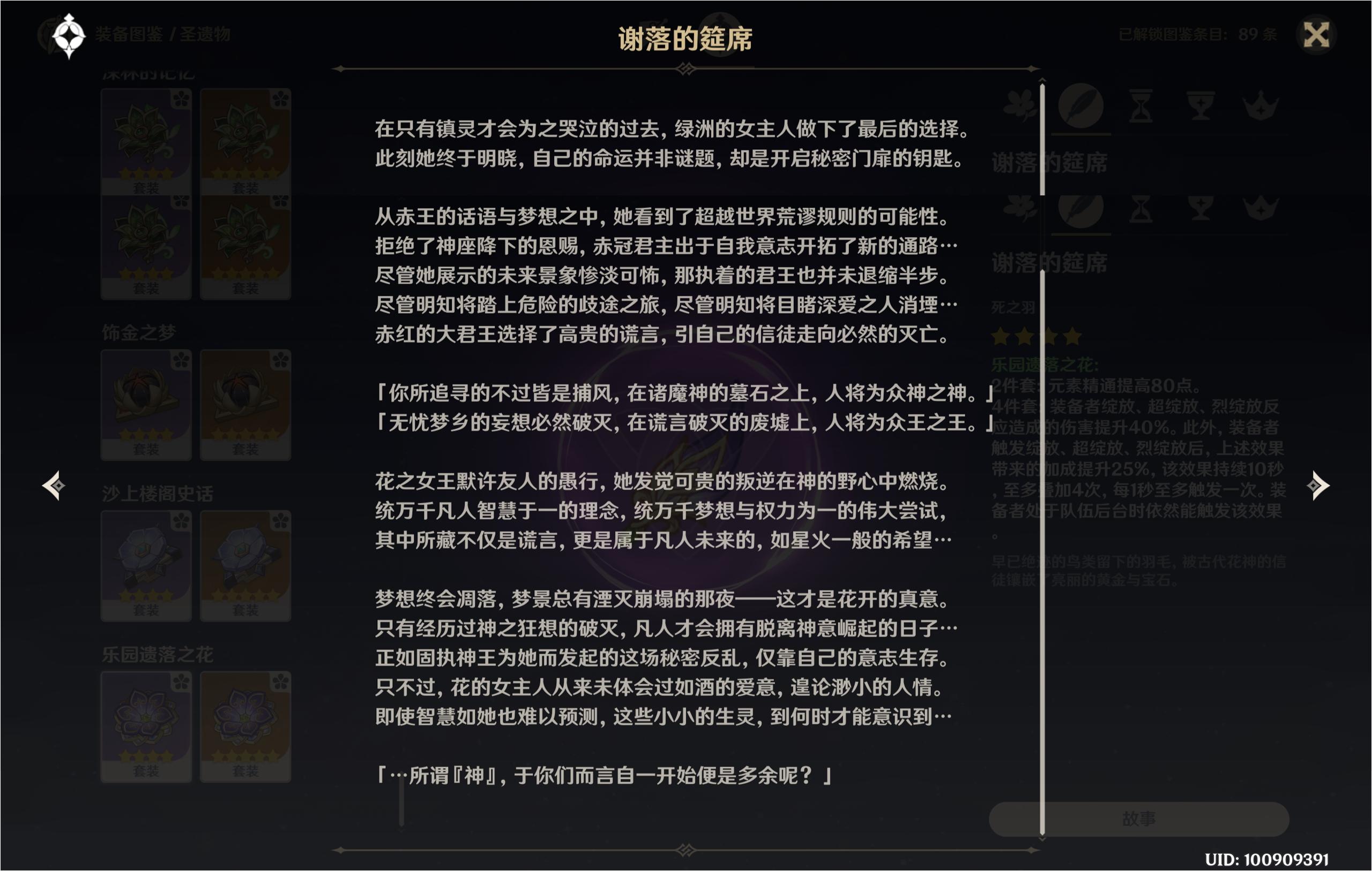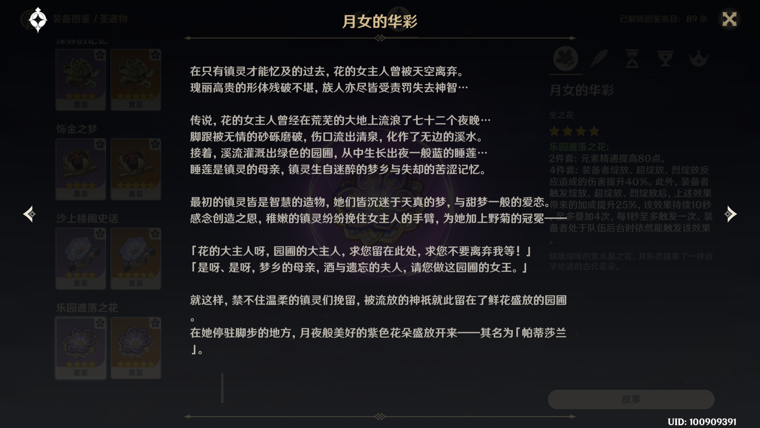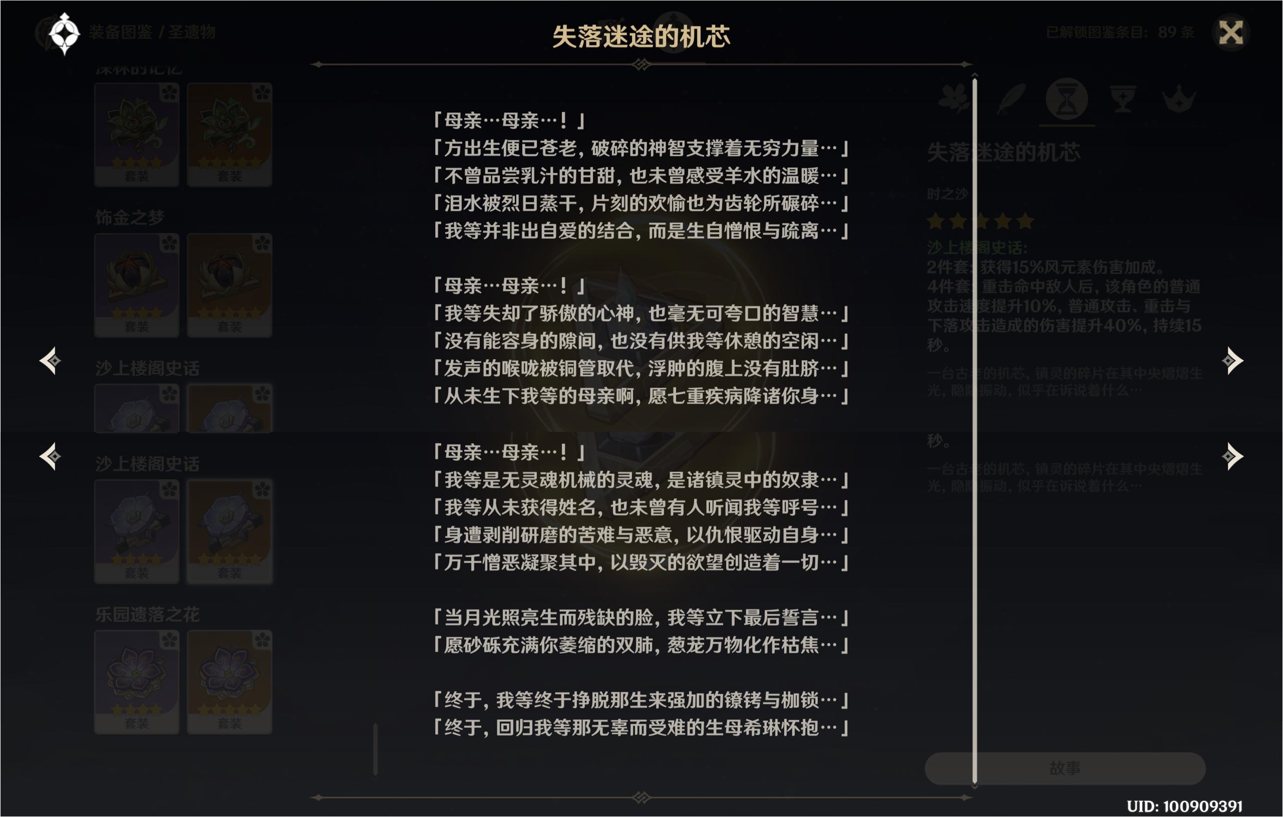 而关于最后遇见的另一位镇灵,菲莉吉丝——说是最精诚守义于花神的一位镇灵也不为过——我们也在刚过去的上个版本(3.3版本)才新出的圣遗物“沙上阁楼史话”(下文暂称“风速套”)的悲哀故事中有所得见。