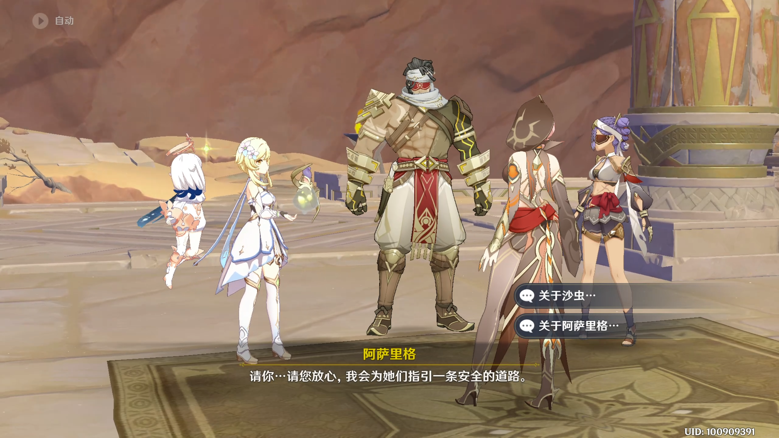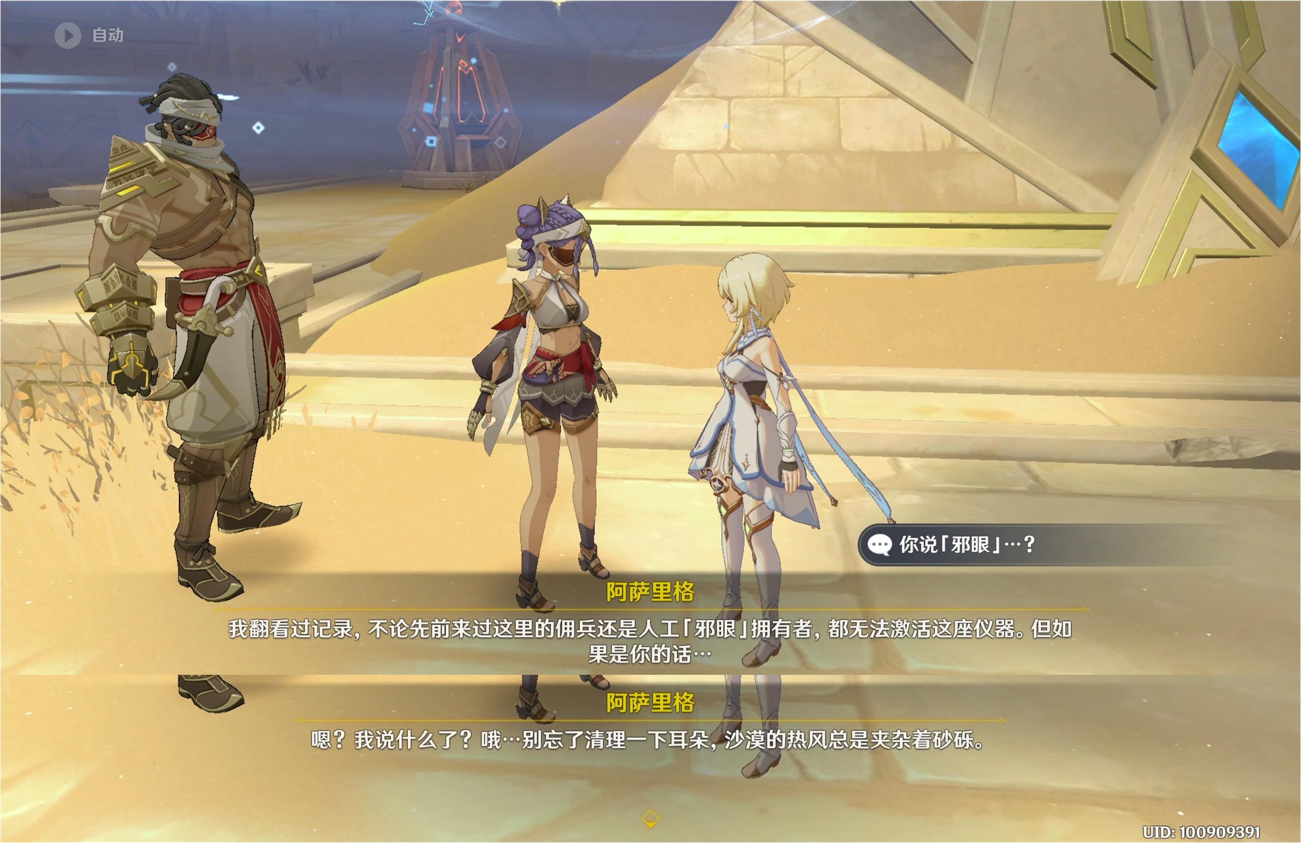 在旅行者/玩家才认识阿萨里格,刚进大门那会儿,旅行者触摸金字塔前,这里有一个 一次性的 回首对话台词——