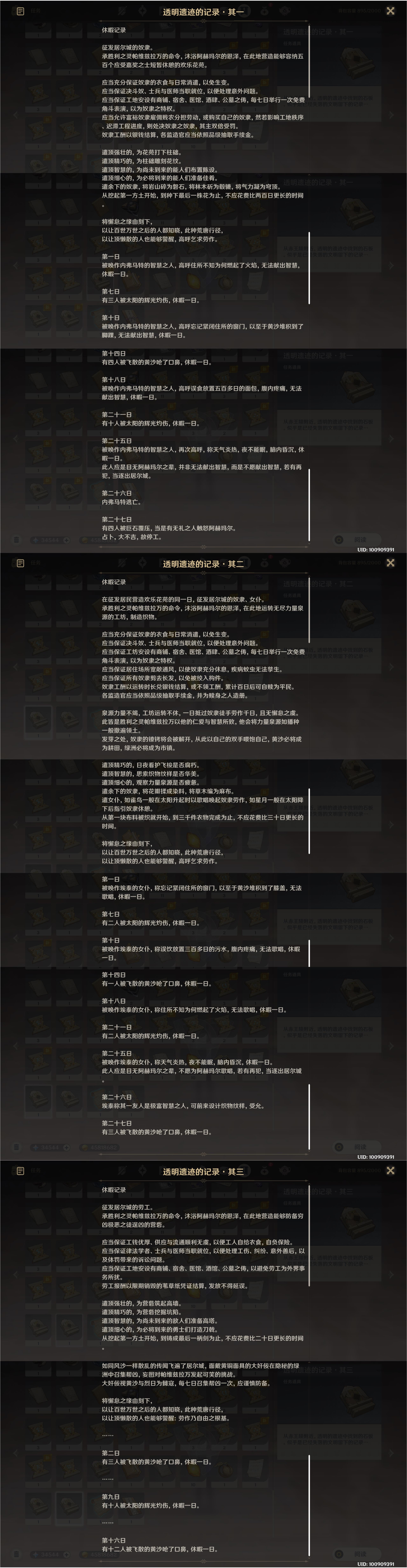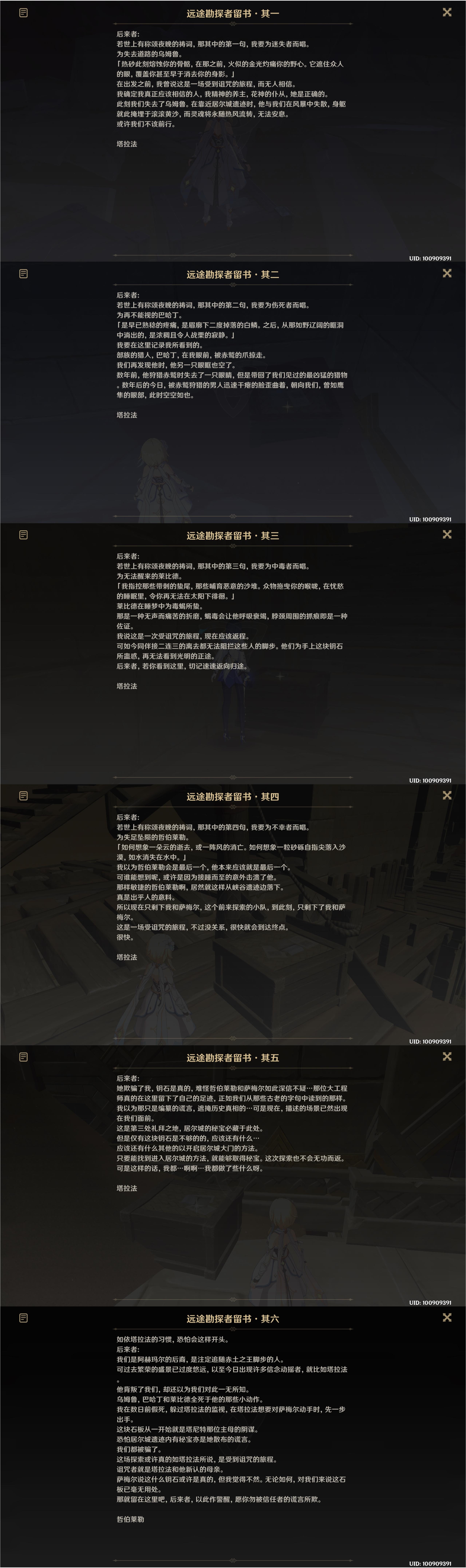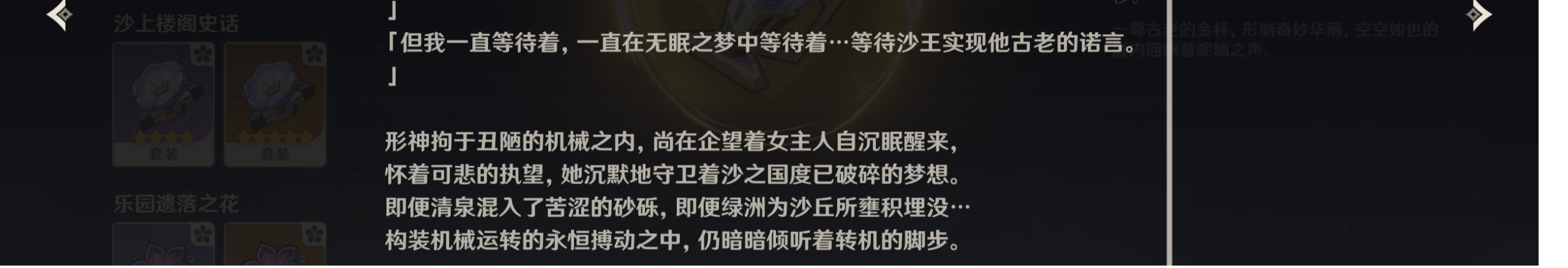 另外,笔者先前的沙漠材料并没收集全,主要是《浮槃歌卷》和《千夜故事集》,所以可能会有相关遗漏(尤其前者好像还挺重要……过两天我直接米游社看看)。