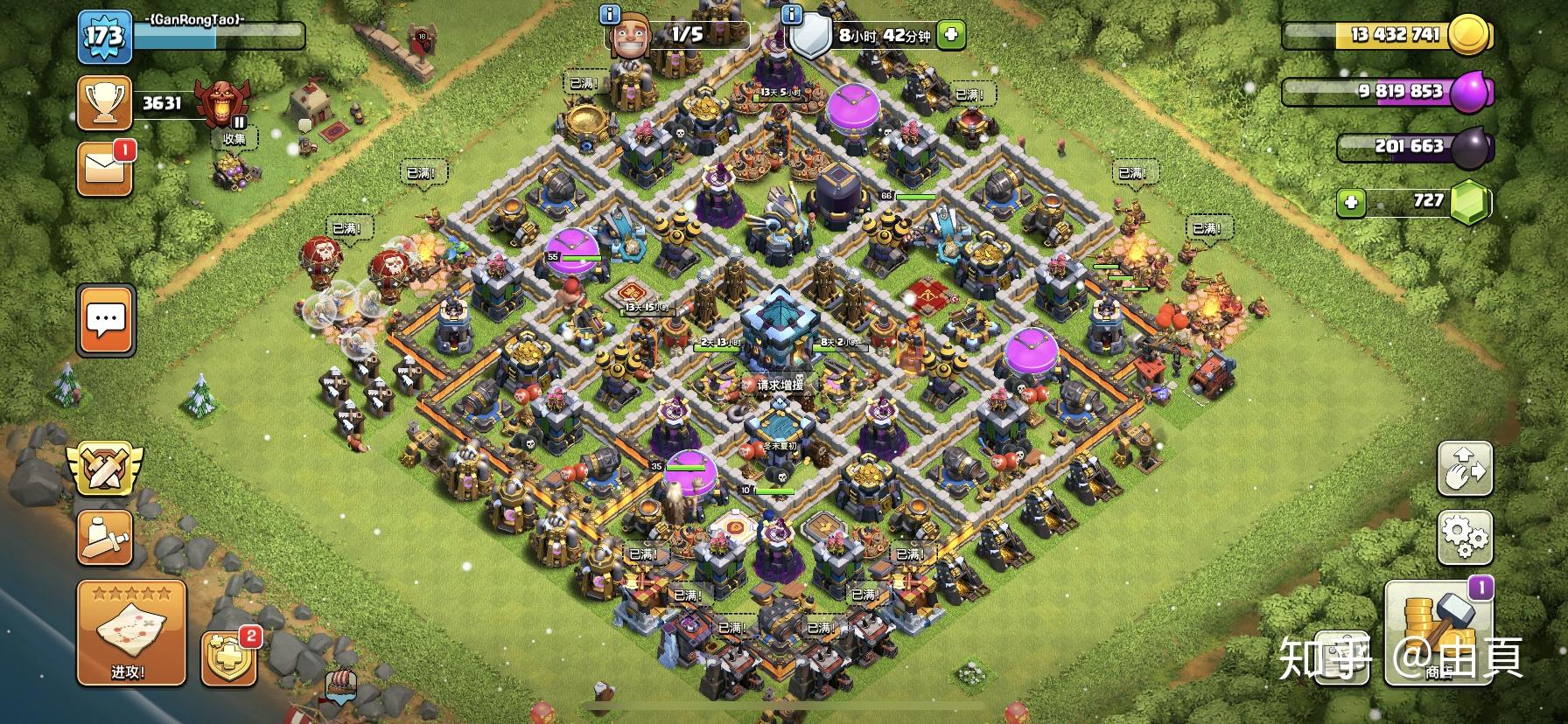 然后我想强调的是,这个游戏不见得玩的越久就越厉害,很多13本老玩家其实技术也不咋地,大师二联赛全两星就有很高的胜率了。想要磨炼进攻技术,还需要去钻研和学习。对于新人来说不用着急,一步一步来,学习技术可以去看看视频和直播。直播现在基本上都是13本,很少有低本的直播。想学习低本进攻技术,我推荐大家去微博上搜 疯蛙 ,可以翻他以前的老视频学习。