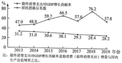 材料一 2013-2019年我国最终消费支出对GDP增长贡献率和居民恩格尔系数的变化