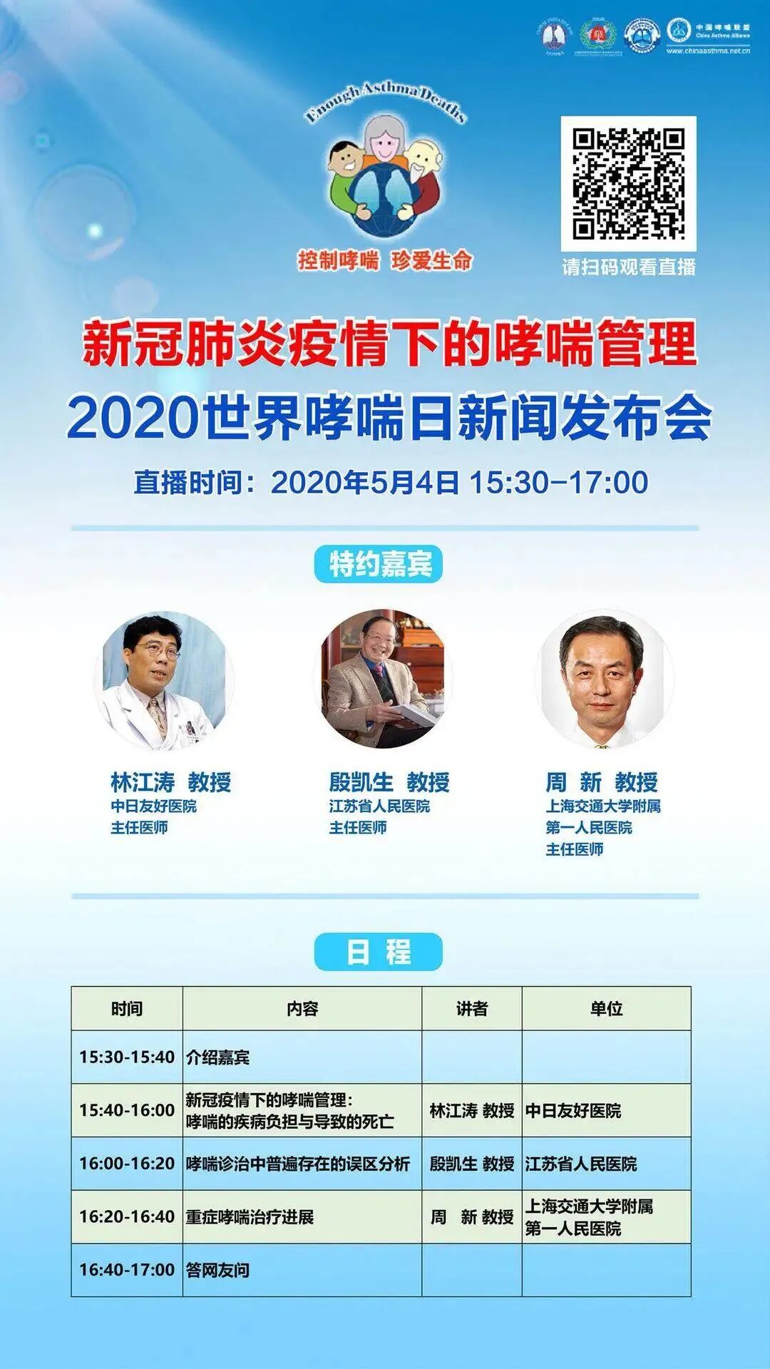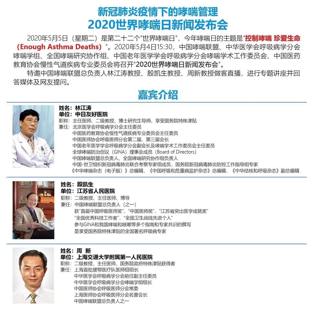 特邀中国哮喘联盟总负责人林江涛教授、殷凯生教授、周新教授做客直播,进行专题讲座并回答媒体及网友提问。