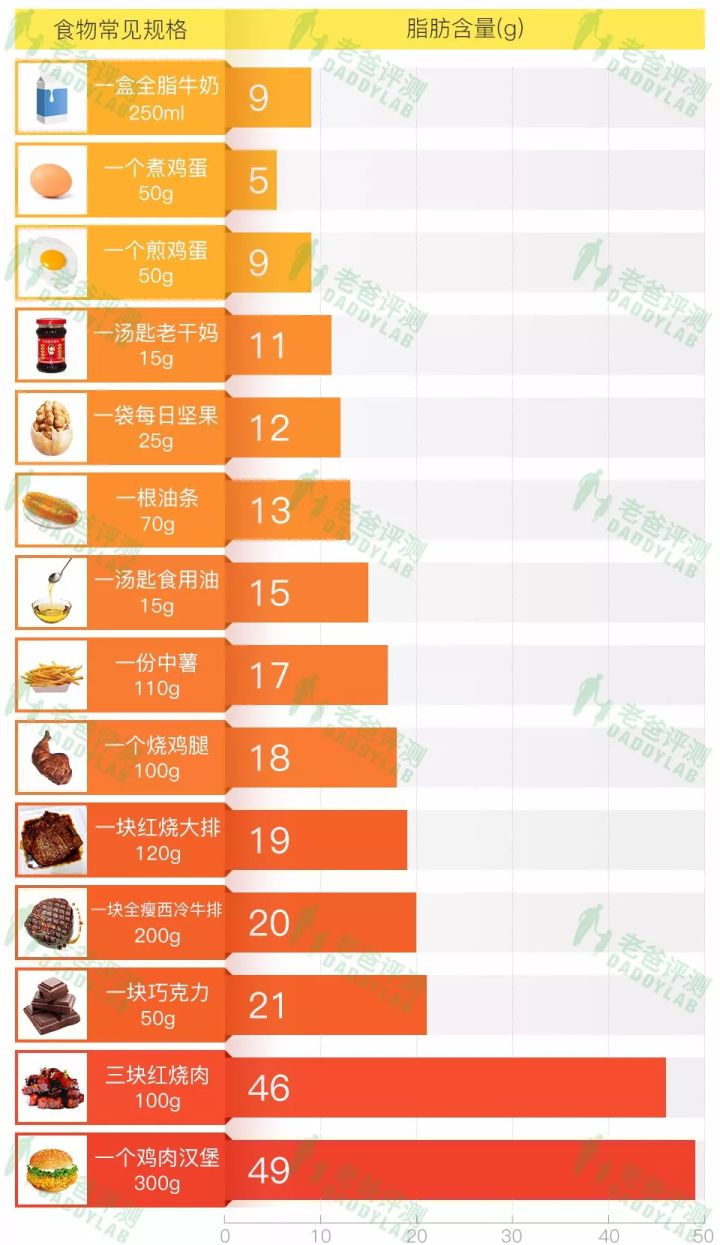 放一张日常生活里常见食物中脂肪的大概含量,你就都明白了。