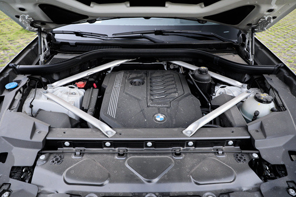 目前在大陆发售的宝马X5,就一款动力总成,3.0T直列六缸发动机,代号B58B30C,最大功率250kW、最大扭矩450Nm。匹配采埃孚8AT变速箱。看参数,这台3.0T跟竞品比差了一点点。还是那句话,宝马的动力总成的实力,不能简单看那几个数字,这点我们在下一节细说。打开机舱看布局,发动机本体尽量缩在前轴后方的特质还在,哪怕是SUV,宝马依旧想把前轴配重尽量平衡。
