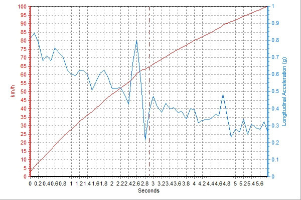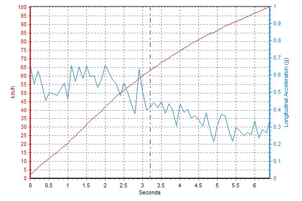 关闭ESP,弹射起步的情况下,宝马X5初段的动力爆发明显会更生猛,起步加速度值高达0.8g,车辆的抬头也更明显,但是4条22寸的宽胎(选装件)依然能够牢牢地抓实地面,四驱系统很好地分配了动力,没有发生轮胎打滑的情况。过了前段,动力的体验与不弹射就没什么区别了,整台车由激进暴躁逐渐回归安稳,最终在5.8s时实现破百。