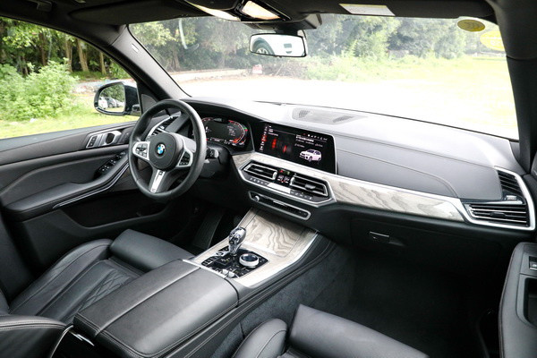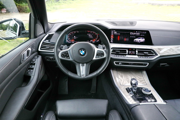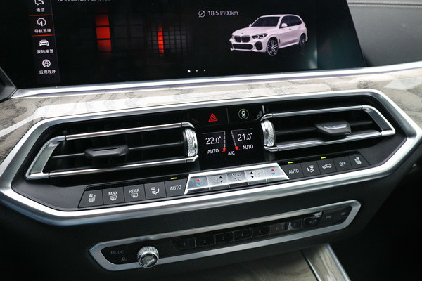 刚拿到这台宝马X5的时候,我心中的这种固有印象被动摇了,这套黑色搭配浅灰色木纹饰板的内饰看起来比以往的宝马车都要更加清新、简洁,却更有视觉冲击力。12.3英寸全液晶仪表和12.3英寸中控屏几乎连为一体,一打开车门就马上吸引住了你的目光。内饰充满了质感细腻的皮质包裹,中控台上、门板上、方向盘上都用上了工整的双缝线,细细去触摸,皮质柔软顺滑,缝线凹凸有致,视觉和触觉上都得到了享受。在空调控制区的位置,宝马X5依然保留了很多实体按键,但是按键的布局不再繁琐,显示温度用的小液晶屏、恰到好处的镀铬点缀、出风口滚轮上的滚花这些细节都凸显了这个区域的设计感和质感。