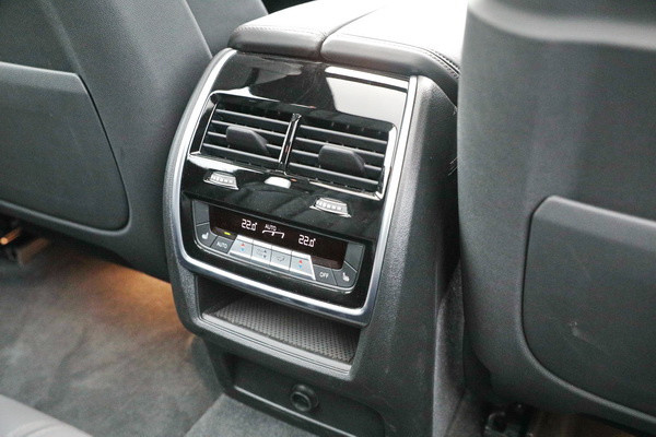 后排舒适性配置方面,中央扶手、杯架和空调出风口肯定是必须有的,宝马X5后排在B柱和扶手箱后位置共有4个空调出风口,还可以选装后排座椅加热和手动遮阳帘,配置水平衬得上它的身份。美中不足的是后排USB接口需要选装(3000块),原车只提供一个12V点烟器接口,需要转接器才能给电子设备充电。