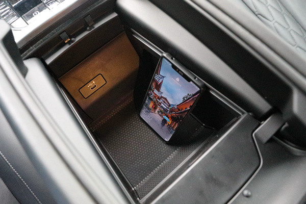 挡把前方带盖的储物格里藏了不少“玄机”,这里不仅有杯座、USB和12V电源接口,而且高配车型还有无线充电面板,还能选装制冷&制热杯座。将这么多功能集成在如此小的空间里,不用时盖板一关,整个内饰瞬间就变得简洁而且高级了。不过,在实际使用时各个功能可能会互相干涉,比如杯架放了水瓶里面的手机就不好取放了。整体来看,这个设计还是利大于弊的,毕竟两边门板的储物格那么大,水杯放那也无碍,把内饰观感这块短板补齐,对于宝马X5来说更为重要。