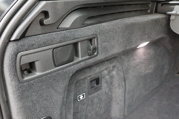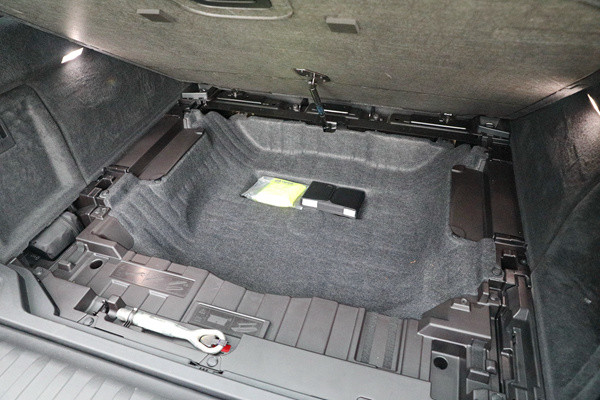尾箱内挂钩、锚点、照明灯、12V电源和后排座椅放倒扳手一应俱全。在尾箱底板下藏了一个很大的储物格,底板带有液压撑杆,开关都很方便,储物格带有绒毛包裹,考虑很周到。
