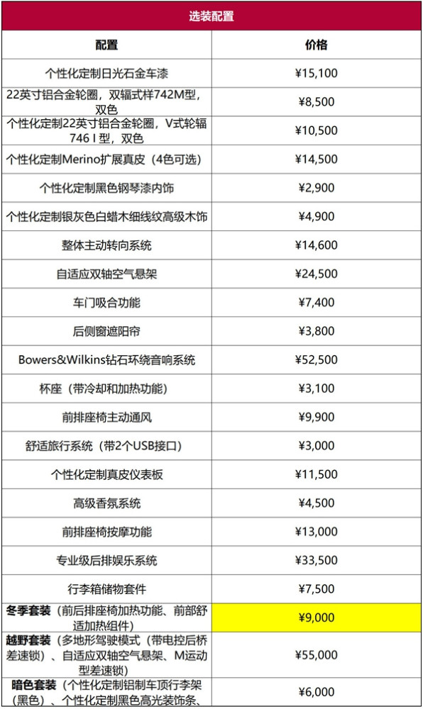 宝马X5的选装配置非常丰富,但是从官网上的配置表来看,这些选装配置基本都只有顶配车型才能加装,低配车型仅可以选装冬季套装。结合价格,22英寸铝合金轮圈双辐式样742M型、个性化定制银灰色白蜡木细线纹高级木饰、自适应双轴空气悬架、冬季套装和暗色套装是我们推荐选装的配置,这些选装件性价比相对来说比较高,对用车体验的提升也比较明显。