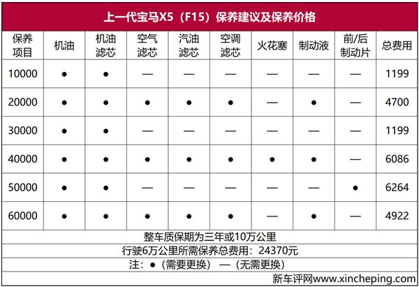 由于全新一代宝马X5上市时间较短,官方的保养价格表仍未更新,我们到宝马4s店询问保养价格,售后保养服务顾问表示全新一代宝马X5的保养周期和保养价格与老款3.0T车型基本相同。作为参考,老款车型保养周期为一万公里一次,小保养价格为1199元,6万公里保养价格为24370元,按照宝马X5的售价,我们认为这个保养价格是很合理的。
