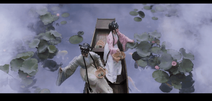 开头第一折,在采莲女的层层掩映下,白娘子和小青缓缓出场,背景水墨式的留白,脚下泛起的水影涟漪,让原本的戏曲写意在银幕上得到了视觉上的感同身受。