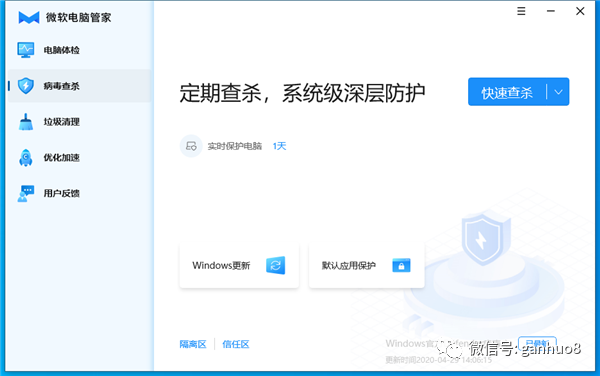 病毒查杀部分,支持快速查杀、全盘查杀、自定义查杀、Windows更新、默认应用保护等,功能还是比较完善的,这个应该很多的电脑的比较喜欢用到。