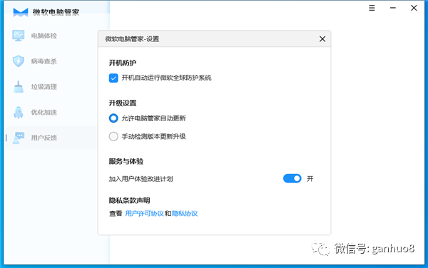用户反馈包括了开机防护、升级设置、服务体验、隐私声明等条款内容和设置。