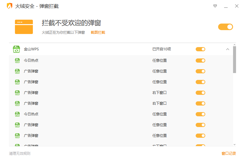 安静:这点简直戳中痛点,火绒安全无任何具有广告推广性质的弹窗和捆绑等打扰用户行为。另外它还有一个专门的弹窗拦截功能,可以禁止软件的弹窗,给你看下我的拦截,我现在打开电脑几乎没有弹窗,弹窗的都是我允许的软件