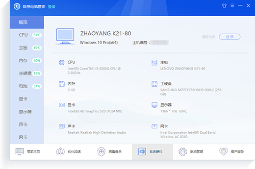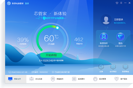 联想电脑管家是由联想PC核心软件团队精心打造的一款专注联想设备健康和安全的软件。拥有电脑体检,优化加速,病毒查杀,网络加速,硬件诊断,原厂驱动管理,客户服务等功能。