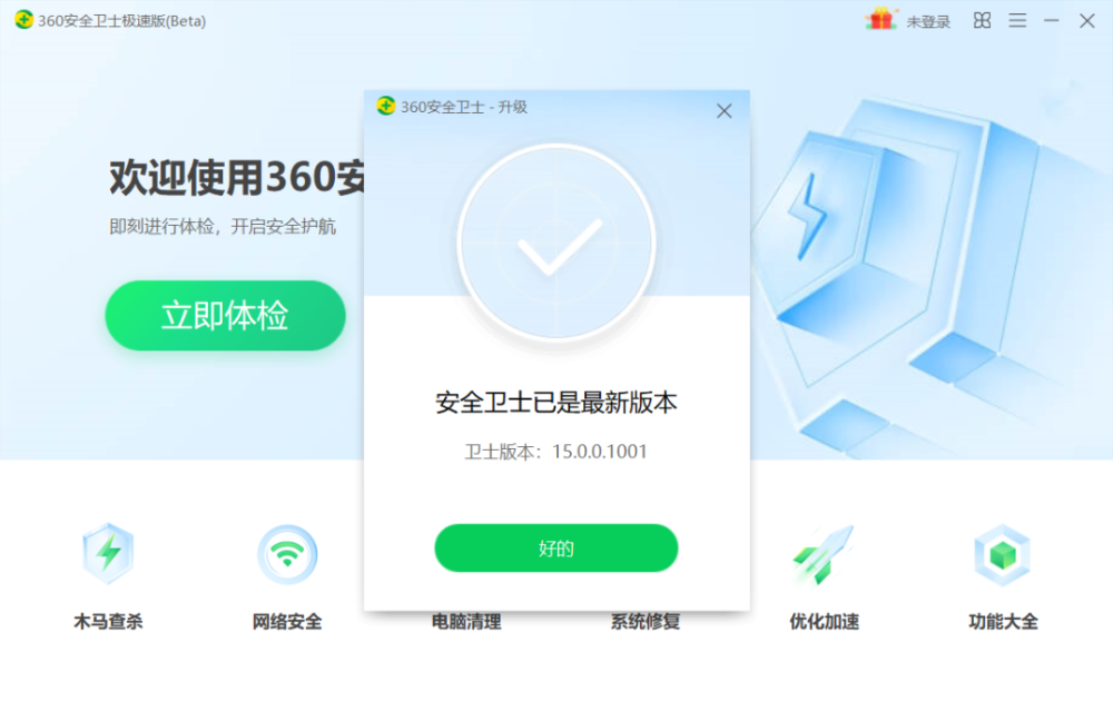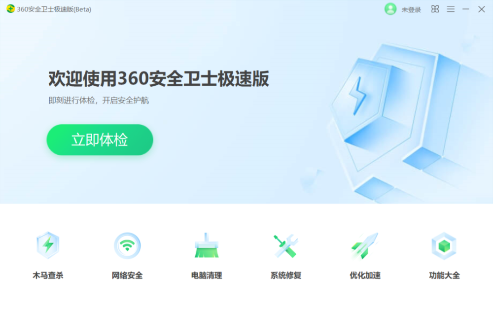 安装完成后,主界面为简洁的上下功能排布。上方为 360 用户熟悉的“立即体检”按钮,可一键进行多项检查清理。下方一排是 360 安全卫士的几大核心功能入口:木马查杀、网络安全、电脑清理、系统修复、优化加速、功能大全。