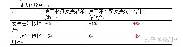 我们再从丈夫的角度来看,对于此时的丈夫来说,转移财产似乎也是一个收益较高的策略。如果遇到上妻子没有怀疑,财产转移成功了,那么收益就很大。如果妻子怀疑了,有了防范,那也是夫妻之间再吵上一架,关系更恶劣一些。因此,对于丈夫来说,转移财产的收益会更大。