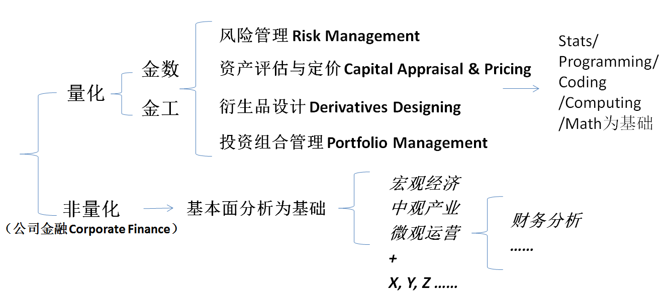 投资领域在国内主要包括证券、基金、期货、信托等,中国与欧美等发达地区的金融市场有着许多不同,如果就金融职业方面来看,和美国比,主要区别是国内对数理分析类(Quantitative)工作类人才的需求较低。按此分类,可以把投资领域的核心划分为两大类:量化类和公司金融类。