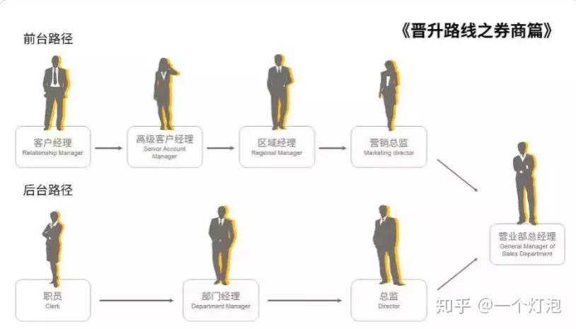 当然,本身从前台后台岗位有两条晋升路径。前台其实是大部分想从事券商行业的求职者的晋升路径:客户经理(Relationship Manager)?高级客户经理(Senior Account Manager)?区域经理(Regional Manager)?营销总监(Marketing Director)?营业部总经理(General Manager of Sales Department)。