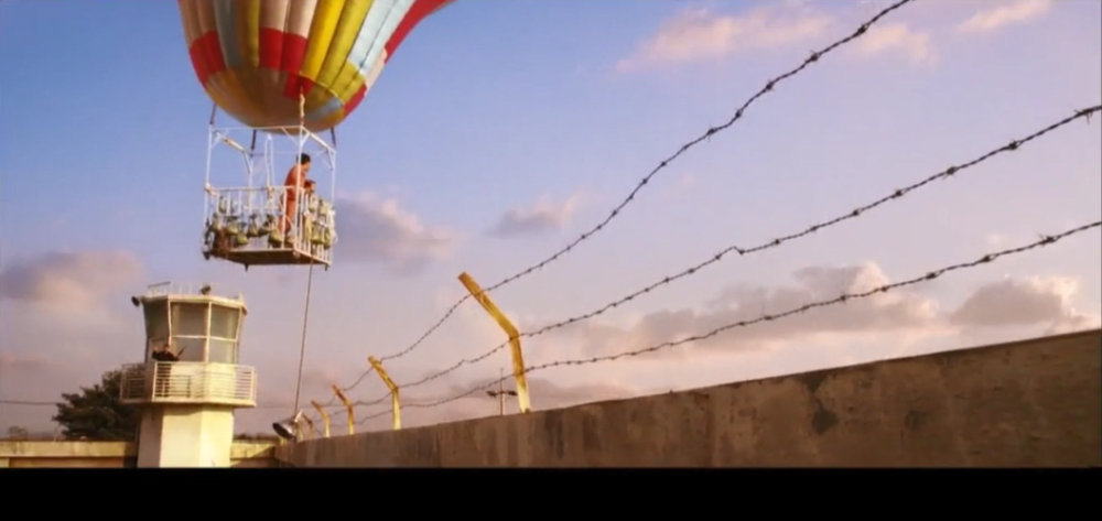 韩国版则不同,画面风格相对轻快明亮。虽然韩版的故事更加惨烈,黑暗的现实也压抑得多,但却采用了喜剧的叙事风格和明亮的色彩。如同童话一般梦幻的热气球,绚烂的晚霞和天空,即便是在高墙的牢房里,墙面也是鲜亮的黄色。