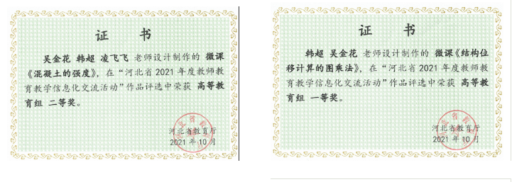 在教学创新大赛、教学基本功等教学竞赛:河北省2021年度教师教育教学信息化交流活动获得一等奖1项,二等奖1项。