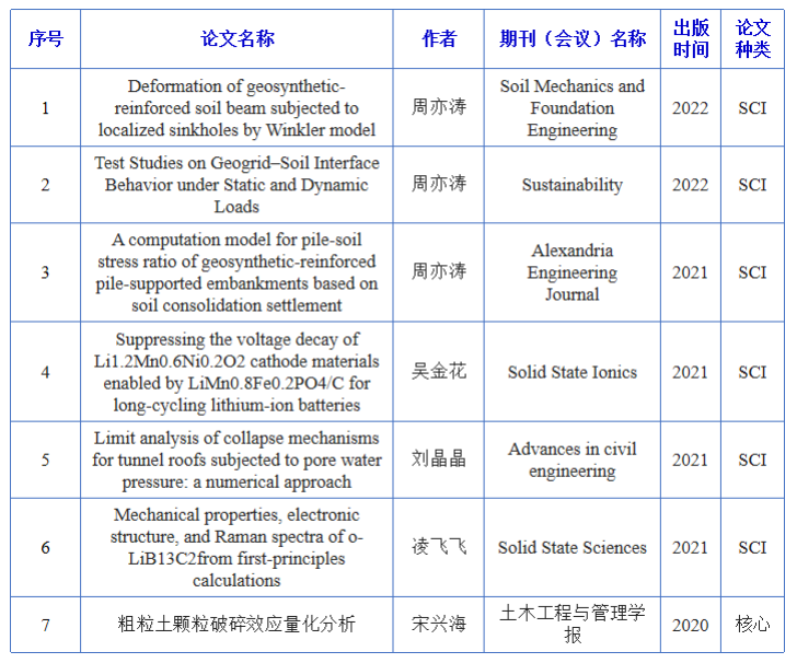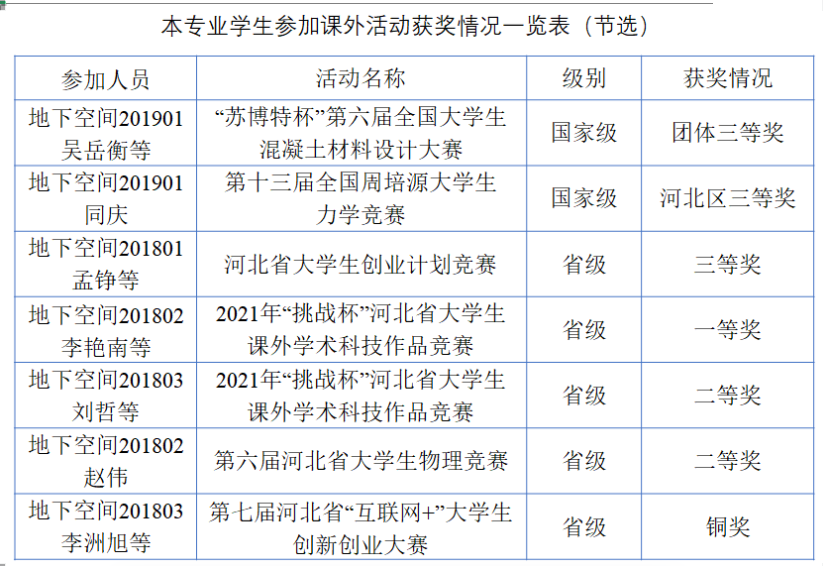 1、科研成果:本专业紧密结合学科建设,积极开展科研工作。专任教师主持省部级、市厅级及校级科技项目30余项;发表学术论文40余篇,其中SCI收录10篇、EI收录4篇;出版著作6部,专利9项。2021年校级岩土与地下工程科研创新团队立项建设。随着本专业教师中博士研究生数量的增多,依托河北省岩土工程安全与变形控制重点实验室、沧州市岩土及地下工程安全与变形控制技术创新中心及多个校级研究中心等平台,本专业的科研水平会不断提升。