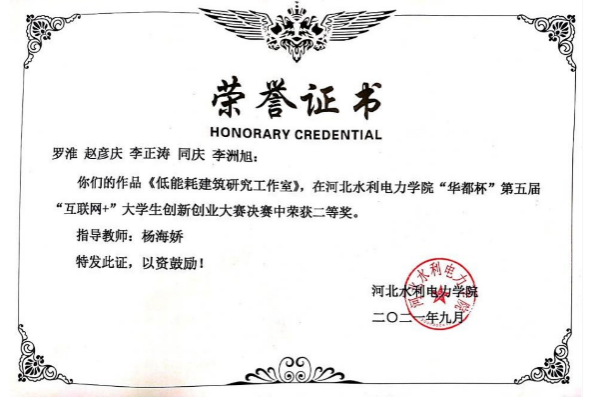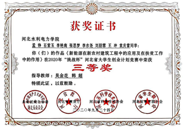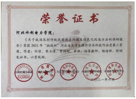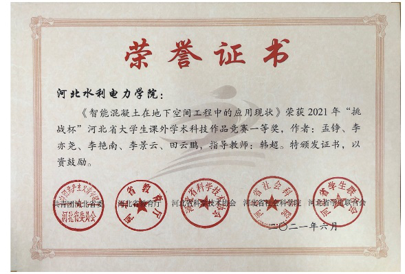 为提高大学生实践创新能力,鼓励学生参加各类比赛,并取得优异成绩。第六届全国大学生混凝土材料设计大赛三等奖1项,第六届河北省大学生物理竞赛二等奖1项,“挑战杯”河北省大学生创业计划竞赛三等奖1项,“挑战杯”河北省大学生课外学术科技作品竞赛一等奖1项、二等奖2项,河北水利电力学院“华都杯”第五届“互联网+”大学生创新创业大赛二等奖1项;获批国家级大学生创新创业项目计划2项,河北省大学生创新创业计划项目5项,河北省大中小学创新能力提升项目1项,2021年河北水利电力学院基本科研业务费项目1项。