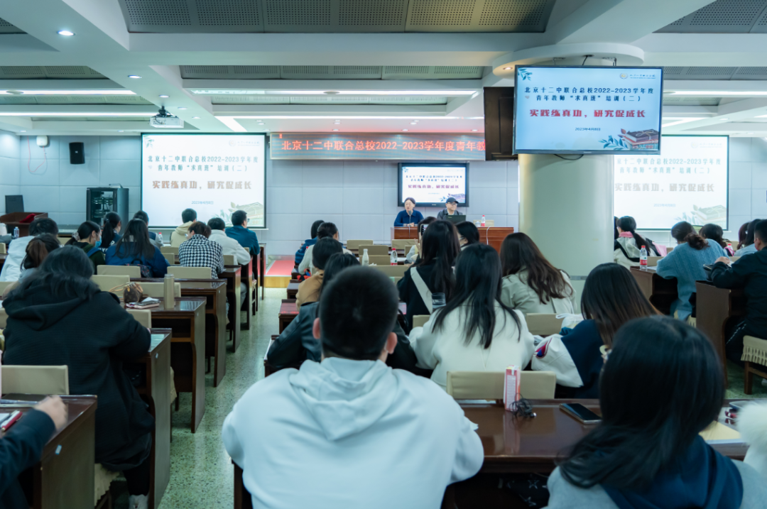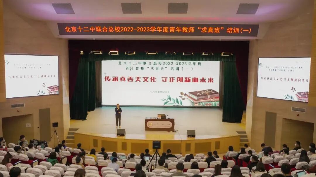 ▲北京十二中联合总校“求真班”青年教师培训启动,给场子、搭台子、压担子、树牌子!