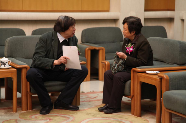 2012年,余未人与冯骥才在人民大会堂发布会前探讨《亚鲁王》