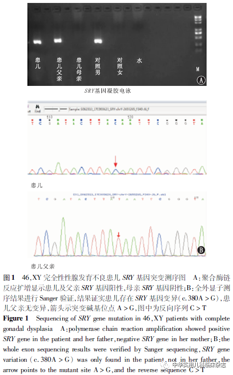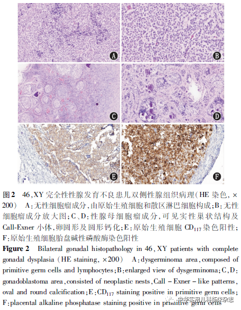 性发育异常(disorder of sex development,DSD)是一组染色体核型与其性腺性别和/或表型性别不一致的先天性疾病,可根据染色体核型分为46,XX DSD、46,XY DSD(Swyer 综合征)及性染色体异常DSD[1]。46,XY DSD染色体核型为46,XY,但社会性别为女性,根据发病机制不同分为性腺发育不良、雄激素合成或功能障碍和其他导致男性性腺发育异常的原因。46,XY DSD遗传背景复杂,临床表型异质性较大,诊断及治疗十分困难。现报道1例以“乳房发育”为首发表现的46,XY完全性性腺发育不良患儿的临床特征及诊治思路,以丰富临床医师对该病的诊治经验。1临床资料患儿社会性别女性,9岁,因“发现阴蒂增大8个月”于2017年4月就诊于浙江大学医学院附属儿童医院内分泌科。8个月前发现阴蒂增大,伴乳房发育,无月经来潮。既往史:6岁4个月时曾因“发现双乳增大4个月”在浙江大学医学院附属儿童医院门诊就诊,当时体格检查:身高128.5 cm,体质量23 kg,体质量指数(BMI)14 kg/m2,双侧乳房发育2期(B2),幼稚女性外阴,未见阴毛生长。查性激素基础值提示黄体生成素(LH)、卵泡刺激素(FSH)、雌二醇(E2)、人绒毛膜促性腺激素(HCG)及睾酮均在正常范围,进一步行促黄体激素释放激素(LHRH)激发试验,发现LH峰值高达29.1 IU/L,FSH峰值高达62.3 IU/L,LH/FSH比值为0.46。家长未予治疗,未定期随访。7岁时乳房发育自行消退。8岁左右再次出现双乳持续增大。家族史:父亲身高 183 cm,母亲身高169 cm,父母非近亲结婚。患儿本次体格检查:身高150 cm(+2 s),体质量36.3 kg,BMI为16.1 kg/m2,双乳B3期,女性外阴,阴蒂肥大,可见尿道、阴道开口,处女膜环稍厚,阴毛发育PH2期,Prader评分1级。辅助检查:性激素基础值提示睾酮2.07 nmol/L(明显升高),LH 1.3 IU/L,FSH 14.48 IU/L,泌乳素(PRL)204.59 mIU/L,E2 100 pmol/L。外周血HCG为45.8 IU/L(明显升高),脑脊液HCG为0.2 IU/L。肿瘤标志物糖类抗原125、糖类抗原199、甲胎蛋白及癌胚抗原均在正常范围。17-羟孕酮、促皮质素、皮质醇、甲状腺功能、肝肾功能均正常。左腕关节正位片显示骨龄约12岁。垂体磁共振平扫未见明显异常改变。肾上腺磁共振平扫显示左侧肾上腺外侧支似略粗。子宫卵巢B超检查显示子宫大小为2.5 cm×1.6 cm×1.4 cm,宫腔线清晰,右侧附件大小为3.1 cm×1.4 cm×1.3 cm,左侧附件大小为3.2 cm×1.5 cm×1.3 cm。经知情同意,对患者及其父母采集外周血进行全外显子测序。全外显子测序送北京迈基诺医学检验所进行。结果显示,患儿染色体核型为46,XY,Y染色体性别决定区(SRY)基因变异(c.380A>G),为错义变异,导致第127位酪氨酸被半胱氨酸取代(p.Y127C)。该突变为自发突变,经家系验证分析,患儿父亲该位点无变异。见图1。患儿染色体核型与社会性别不一致,外周血HCG明显升高,考虑发生生殖细胞肿瘤,遂进一步行膀胱镜+阴道检查术+腹腔镜检+双侧性腺活检术,术中见阴道开口位置正常,阴道长7 cm,可见子宫颈,盆腔内可见子宫,双侧性腺呈条索状。初步病理提示左侧性腺无性细胞瘤,右侧性腺母细胞瘤。患儿性腺已发生恶性肿瘤病变,进一步行腹腔镜下双侧肿瘤切除术。患儿病理结果显示左侧性腺由两部分肿瘤细胞组成。一部分为低倍镜下大片境界不清的实性结构,由过度增生的原始生殖细胞和散区淋巴细胞构成,肿瘤细胞较大,大小较一致,呈圆形或类圆形,核膜清晰,核仁明显,核分裂多见,免疫组织化学染色显示该细胞呈胎盘碱性磷酸酶(PLAP)及CD117阳性,为无性细胞瘤表现。另一部分低倍镜下可见卵巢样间质,内见实性透亮巢状结构及 Call-Exner 小体,局部见圆形钙化,为性腺母细胞瘤表现。右侧性腺为典型的性腺母细胞瘤,镜下见大量实性巢状结构及 Call-Exner小体,并可见较多卵圆形及圆形钙化(图2)。