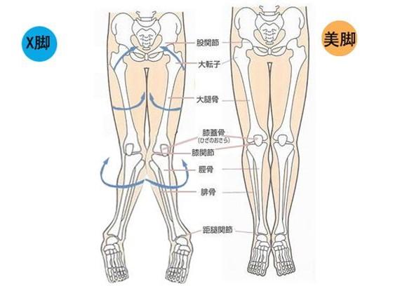 首先先了解一下,什么叫x型腿。X型腿是我们常见的一种说法,专业术语上我们叫做膝外翻。主要原因是由于构成膝关节的两块骨头中的股骨内旋,胫骨相对外旋,而造成膝关节的Q角过大,膝关节呈现外翻的状态。