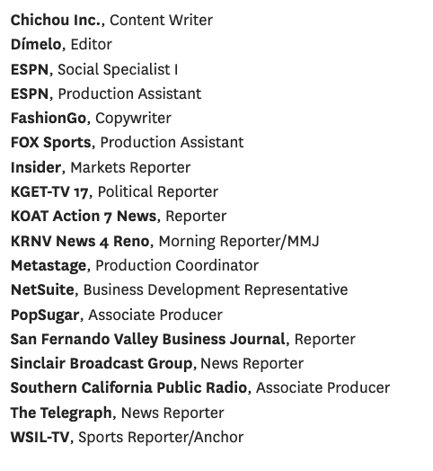 硕士生本科生留美工作,去向如上述板块所说,根据不同的专业有所不同,但大部分都在公司、媒体、广告/公关/营销/内容/创意公司、咨询公司等等,职位一般为初级岗位(entry-level position)。 以百事公司为例(PepsiCo.), 它旗下传播/品牌/营销相关的职位非常多,比如传播经理、传播主管、撰稿人、媒体经理、社交媒体社区经理、社交媒体内容创建者、品牌经理、客户主管、数字媒体专家等等。