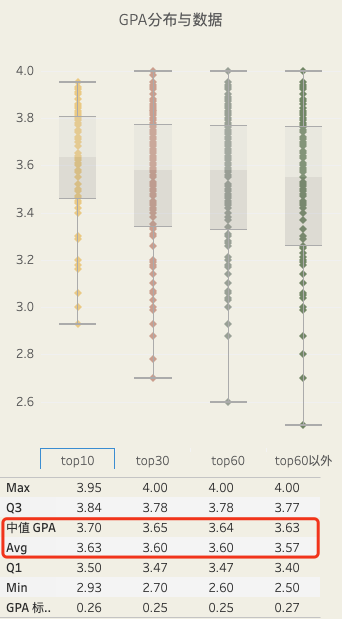 ALPHA通过对过往831条录取数据的分析,在60名获得Top10录取的学生中,仅有1名GPA是2.93低于3.0,在299名获得Top30学校录取的学生中仅有4名低于3.0。