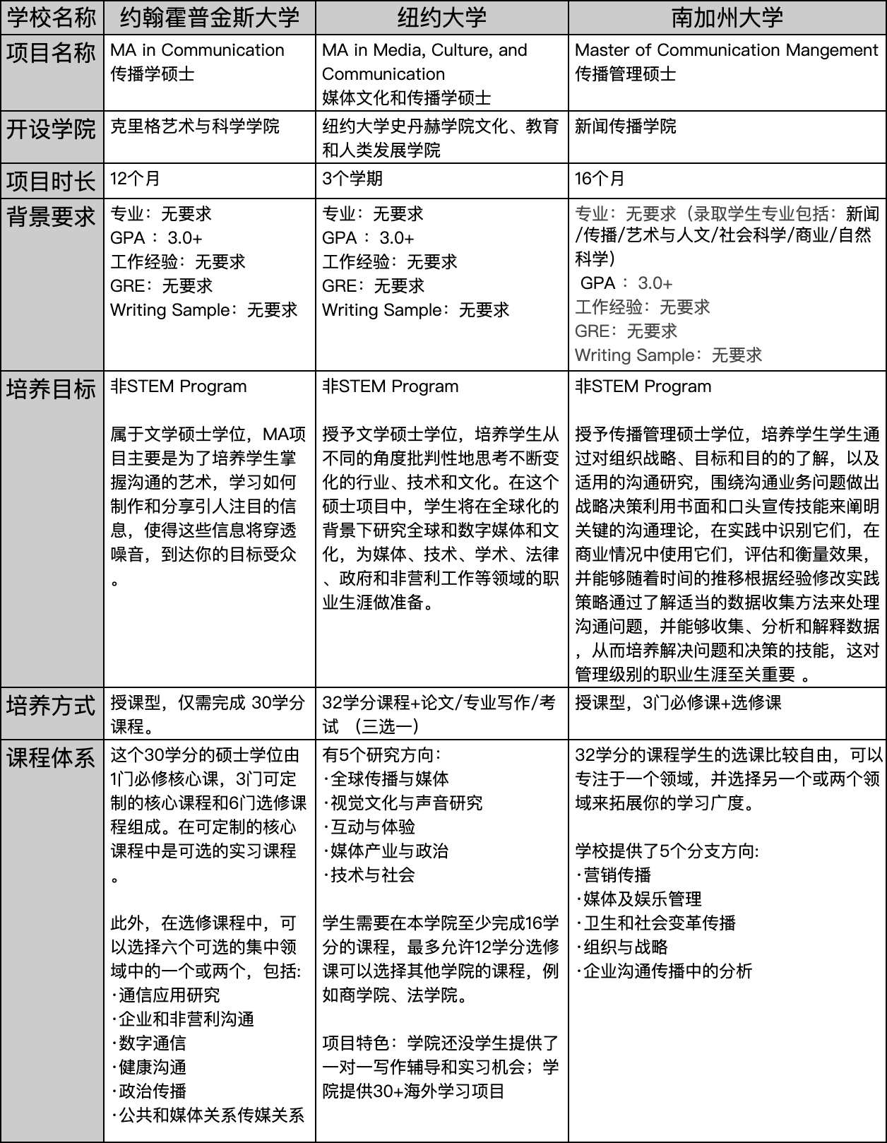 PS:传播学专业的申请对于申请者的学术背景没有任何要求,例如约翰霍普金斯大学的传播学专业欢迎拥有本科学位,来自各种专业背景的学生。
