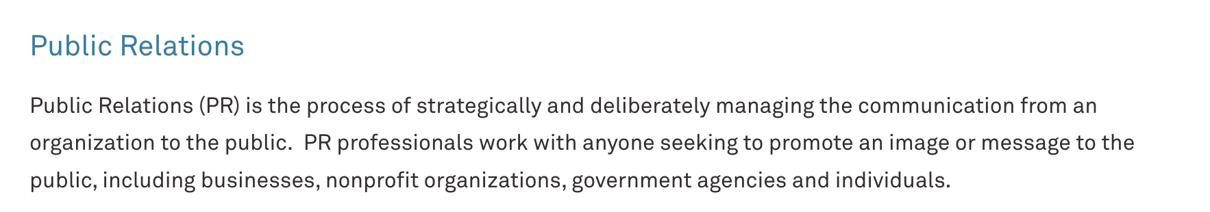 公共关系 (Public Relations,简称PR) 是战略性地和有意识地管理从组织到公众的沟通的过程。